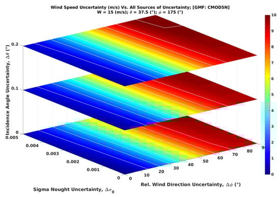 The uncertainty in SAR SSW speed obtained through a GMF inversion procedure depends on several parameters. In particular, the uncertainty ΔWmax is mainly affected by both the triplet of uncertainties (Δσ0,Δθ,Δφ) (bullet i, Section 3) and the true state triplet (σ0,θ,φ) (bullet ii, Section 3). Figure 3 and Figure 4 highlight the relevance of all combining parameters.