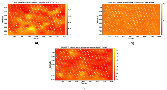 Figure 7 illustrates the contribution to the total CMOD5.N-derived SAR SSW speed uncertainty ΔWmax (m/s) (Figure 6h), due to the true state (σ0,θ,φ), and only a single uncertainty term among the ones regarding the NRCS (Δσ0) (a), the incidence angle (Δθ) (b), and the MS LG-Mod SSW (relative) direction (Δφ) (c). Again, all maps are obtained at 5 km by 5 km from the same S-1 IW crop image used for Figure 6. According to results shown in Figure 5, as well as to statistics reported in the first column of Table 3 (regarding the case of CMOD5.N and the 5 km ROI dimension), Figure 7a–c confirm respectively that the higher contribution to the total SSW speed uncertainty derives from the uncertainty of the SSW direction, the intermediate one is associated with the NRCS uncertainty, while the lower one is linked to the uncertainty of the incidence angle. The correlation between ΔWmax (Figure 6h) and ΔW3 (Figure 7c) is quite clear.