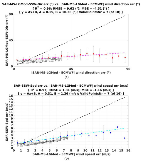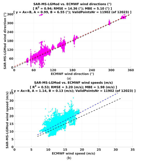 Figure 8a illustrates the scatterplot of the MS LG-Mod SSW direction (y axis) and the ECMWF model direction (x axis), for all the 5 km by 5 km ROIs (N_ROI = 11,902). The values of R2 (=0.94), RMSE (=14.36°) and MBE (=5.10°) reveal a quite good agreement between the SAR-based technique (in the case of wind rows visibility) and the global NWP model (when applied to open waters) in wind direction estimation. Similar plots and results (R2 = 0.97; RMSE = 11.53°; MBE = 5.19° and R2 = 0.98; RMSE = 10.63°; MBE = 5.15°) were obtained for all the 10 km and 15 km square ROIs, respectively. Figure 8b reports instead the scatterplot of the SAR SSW speed (y axis) and the ECMWF model speed (x axis), for the same ROIs and the CMOD5.N. Statistics obtained from the comparison between the SAR-derived SSW speed and the ECMWF one (R2 = 0.53; RMSE = 3.20 m/s; MBE = 1.98 m/s, and R2 = 0.53; RMSE = 2.76 m/s; MBE = 1.50 m/s for CMOD5.N and CMOD7, respectively) show less agreement in wind speed estimation compared to wind direction estimation, for both applied GMFs. This fact is true also for the 10 km (R2 = 0.56; RMSE = 2.99 m/s; MBE = 1.88 m/s, and R2 = 0.56; RMSE = 2.56 m/s; MBE = 1.41 m/s for CMOD5.N and CMOD7, respectively) and the 15 km (R2 = 0.57; RMSE = 2.96 m/s; MBE = 1.89 m/s, and R2 = 0.57; RMSE = 2.52 m/s; MBE = 1.41 m/s for CMOD5.N and CMOD7, respectively) processing results.