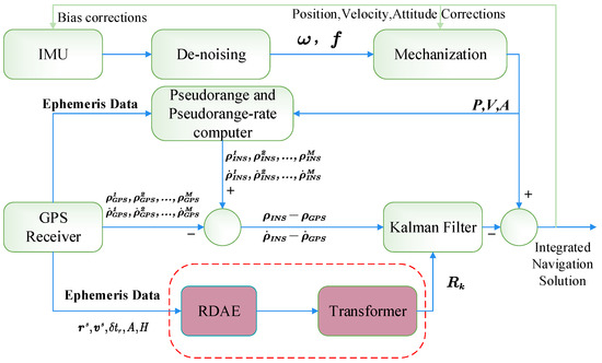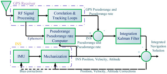 In this study, the tightly coupled navigation system was considered to have a higher performance than the loosely coupled navigation system. We first describe the standard tightly coupled integrated system [32], the block diagram of which is shown in Figure 1. As shown in Figure 1, the difference between pseudorange and pseudorange rate measurements from the GNSS and corresponding INS prediction values are fed into the KF to estimate the INS error. Then, the output result of the INS is corrected according to the correlation error to obtain the final navigation and positioning result.