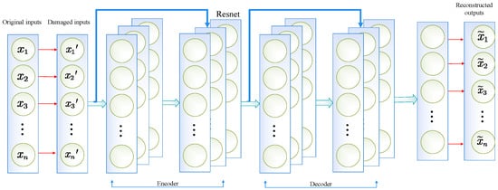 Considering that the raw data from satellite ephemeris inevitably contain various noises, we use the proposed RDAE neural network for feature extraction, which fundamentally combines the advantages of Resnet and AE, and eliminates the relevant noise in the original sensor data through the method of signal reconstruction. Firstly, the data feature loss phenomenon is simulated by randomly removing features from the original input matrix using some probability distribution. The network uses this missing data to calculate and iterate the error between the refined data and the original. In this way, the network learns the corrupted data. There are two reasons why this corrupted data is very significant: For one, the weight noise trained on corrupted data is relatively small by comparison with non-corrupted data training. Second, the corrupted data, to some extent, reduces the gap between the training data and the test data. The robustness of the weight trained in this way is improved [36]. As illustrated by Figure 3, the encoder and decoder of RDAE contains Resnet rather than the fully connected layers.