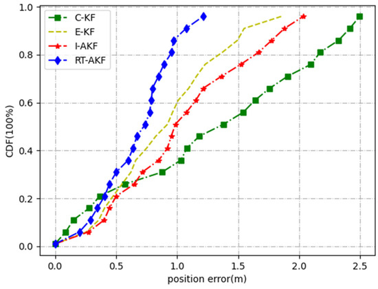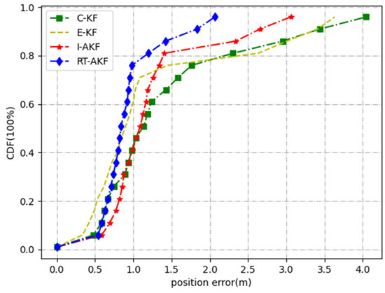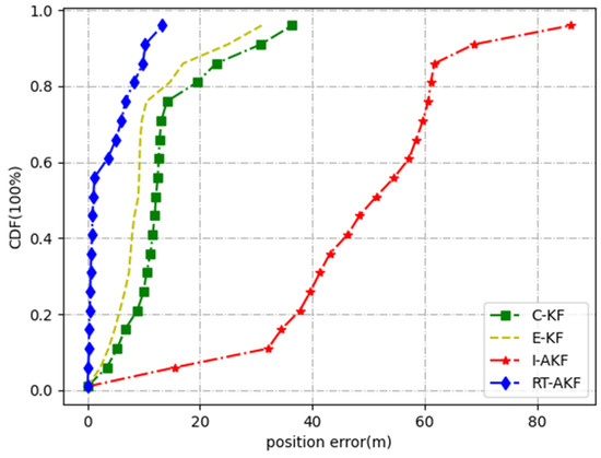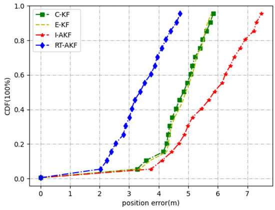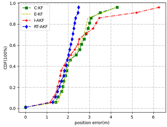 Road segment #5 was the viaduct part. The car rotated several times from top to bottom on the viaduct, which fully reflects the occlusion of the satellite signals in this scene. As Table 7 shows, the maximum and minimum values of the errors obtained were not very different under the comparison of the four methods, but the mean and variance obtained by our proposed method RT-AKF as the smallest. From the experimental results in Figure 15 and Figure 16, the C-KF, E-KF and I-AKF methods achieved similar accuracy at 67% confidence compared with our proposed RT-AKF method; however, the positioning error of I-AKF method at 90% confidence diverged to about 2.8 m. In addition, the maximum position error of the C-KF method at certain moments even reached more than 4 m, indicating that the stability of other methods is poor.