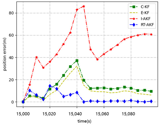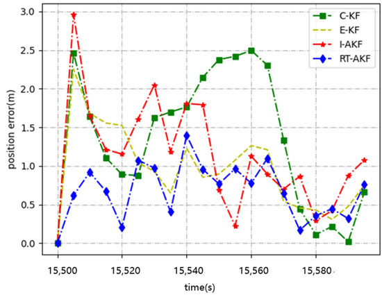 Road segment #2 is a complex scene where only one or two satellites are received; therefore, the position error will be relatively large. From the experimental results in Figure 9 and Figure 10, we can indicate that our proposed RT-AKF method performed the best compared with other traditional methods. The I-AKF method had the worst performance: the maximum position error even reached 112.08 m, and the average error exceeded 50 m, as shown in Table 4. The reason for the failure of the I-AKF method may be due to the poor quality of the satellite signal, so adaptively adjusting the noise covariance through innovation becomes more inaccurate, so this method fails. Our RT-AKF method had an average error of only 3.03 m and a minimum error of only 0.03 m, which was completely better than the other three traditional methods.