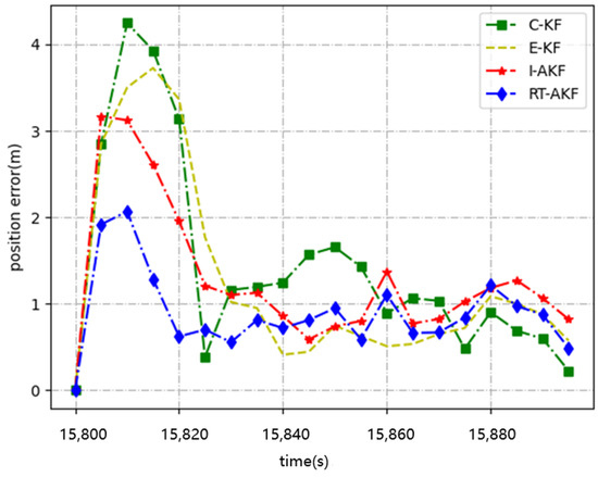 Road segment #3 was an urban canyon, which may affect GNSS signal reception. As Figure 11 and Figure 12 show, it can be observed that the position error in the middle section was generally higher than that in other sections. It may be that the satellite signal was blocked at this time, so the method based on I-AKF had the largest error at this time: the largest even reached 14 m. As shown in Table 5, compared with other methods, our proposed method RT-AKF obtained the smallest position error, with an average error of 1.54 m.