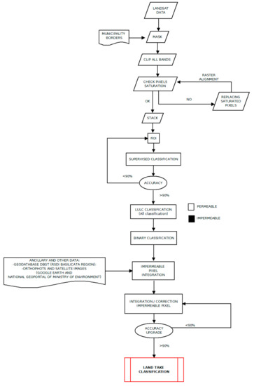 Land use is one of the drivers of land-cover change (LCC) and represents the conversion of natural to artificial land cover. This work aims to describe the land-take-monitoring activities and analyze the development trend in test areas of the Basilicata region. Remote sensing is the primary technique for extracting land-use/land-cover (LULC) data. In this study, a new methodology of classification of Landsat data (TM–OLI) is proposed to detect land-cover information automatically and identify land take to perform a multi-temporal analysis. Moreover, within the defined model, it is crucial to use the territorial information layers of geotopographic database (GTDB) for the detailed definition of the land take. All stages of the classification process were developed using the supervised classification algorithm support vector machine (SVM) change-detection analysis, thus integrating the geographic information system (GIS) remote sensing data and adopting free and open-source software and data. The application of the proposed method allowed us to quickly extract detailed land-take maps with an overall accuracy greater than 90%, reducing the cost and processing time.