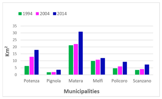 The graph in Figure 6 represents the increasing growth rate of the overall built-up municipalities analyzed. The most significant amount of land take occurred between 2004 and 2014 in all municipalities investigated, suggesting that both the socio-economic and natural features drive the urbanization of these areas.