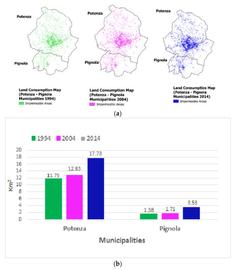 (a) Observed built-up growth in square kilometers in the studies areas from 1994 to 2014 in the Municipalities of Potenza and Pignola. (b) In green, land take in 1994; in pink, land take in 2004; and in blue, land take in 2014.