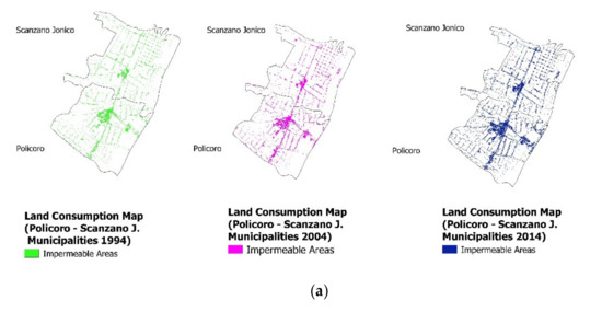 Furthermore, in this case, indeed, most of the impermeable soil is located near the inhabited centers that have developed close to the main road that connects the area with the neighboring regions (Puglia and Calabria). The area of the two municipalities is characterized by a solid anthropic tourism pressure along the coasts, occurring in recent years, following the construction of tourist infrastructure; this has resulted in an essential waterproofing of the entire Ionian coast. The area considered is also intensively cultivated by different crops ranging from vegetables to crops of valuable fruits; over the years, we have witnessed the gradual construction of greenhouses and roads of relevance that have contributed to the increase of land take in agricultural and rural areas.