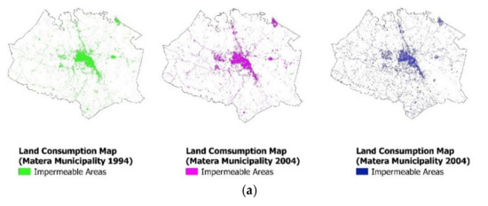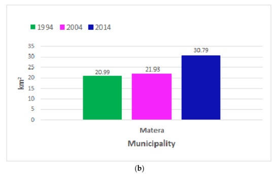 Matera has an evident urban sprawl similar to the case of Policoro and Scanzano Jonico: new buildings are mainly located along the main roads. The construction of new buildings has been haphazard both close to the urban center and in the suburbs. Additionally, in the case of Matera, an essential percentage of the increase of impermeable soil is linked to the presence of infrastructures. Matera, in 2019, was the European Capital of Culture. Consequently, in previous years, many services and infrastructures were realized throughout the municipality, increasing the phenomenon of soil sealing (Figure 10a,b).