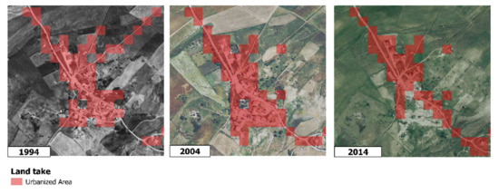 In the six municipalities described above, the historical evolution of land take due to increased impermeable surfaces (built-up/urbanized) was analyzed. A gradual intensification process of urbanized areas has emerged by analyzing and comparing the binary maps of land take obtained in the three different reference years (1994, 2004, and 2014). The results show that the municipalities analyzed underwent an evident territorial transformation in the twenty years considered, characterized by a steady increase in land take.
