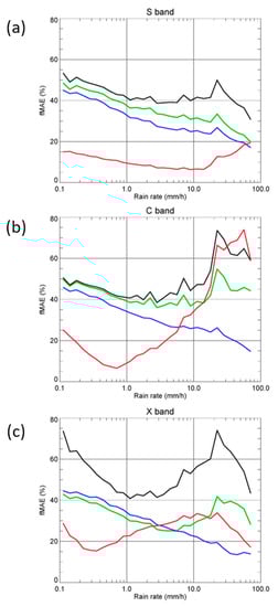 Dependencies of the fractional mean absolute error (fMAE) on rain rate for the R(Z) (black curves), R(Z, ZDR) (green curves), R(KDP) (blue curves), and R(A) (red curves) relations optimized for the Oklahoma DSDs at S, C, and X bands panels (a), (b), and (c), respectively.