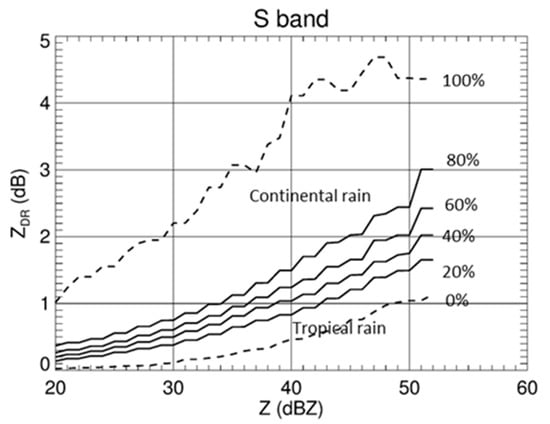 The radar retrieval formulas used for plotting scattergrams in Figure 1, Figure 2 and Figure 3 are optimized for a disdrometer dataset obtained in Oklahoma. The parameters of radar rainfall relations vary depending on rain type, therefore such relations should be adjusted using DSD data collected in a particular climate or geographical area. Microphysical characteristics of rain may vary in a wide range even in a particular geographical region such as Oklahoma. Different types of rain can be distinguished using the average dependencies of ZDR on Z. Figure 5 shows Z–ZDR dependencies corresponding to different percentiles of ZDR for a given Z in rain simulated from 47114 DSDs measured in Oklahoma. The simulations are for S band at T = 20 °C. A tropical rain, a bulk of which is generated via a “warm rain” process below the melting layer, is commonly characterized by high concentration of small- and medium-size drops with a relative deficit of large drops which results in a lower value of ZDR at a given Z as in the 0–20% range of ZDR between two lowest curves in Figure 5. A continental rain, mostly originated from melting ice, is usually dominated by large raindrops with a lower concentration of small drops as opposed to the tropical rain and is characterized by higher values of ZDR for a given Z. The two families of DSDs belonging to the 0–20% and 80–100% ranges can be designated as “very tropical” and “very continental” rain. In Figure 6, the log(R) vs. A scatterplots corresponding to the very tropical rain at S, C, and X bands are marked by red symbols, whereas the very continental scatterplots are presented in blue symbols. It is evident that the clusters associated with these two rain types almost coincide at S band and become more separated at C and X bands. The R(A) relations are especially beneficial for lower rain rates and for tropical rain of any intensity (red clusters). At C and X bands, the separation between red and blue clusters identifies that different R(A) relations must be utilized for tropical and continental rain. For a given rain rate, the value of A is larger for a continental rain which means that the multiplier in the R(A) relation should be lower for a continental rain. It can be shown that a similar rule is applied for the R(KDP) and R(Z) relations.