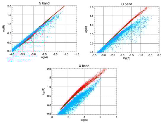 Scatterplots of log(R) vs. log(A) at S, C, and X bands for “very tropical” rain (red dots) and “very continental” rain (blue dots). Specific attenuation is computed for the temperature 20 °C.