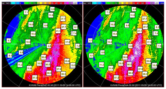 An alternative methodology for polarimetric VPR (PVPR) implies determination of the heights of the ML top and bottom over large areas using the recent melting layer detection algorithm (MLDA) described in []. According to this methodology, a multitude of the model radial profiles of Z and ρhv at lowest antenna tilts for different heights and “strengths” of the ML are simulated and stored in lookup tables. The “strength” of the ML characterizes both its thickness and the depth of the corresponding ρhv minimum that is usually well-correlated with the Z enhancement in the ML. The simulation routine explicitly takes into account radar beam broadening that has a strong impact on the ML signature at lower antenna elevations and large distances from the radar. Then an appropriate model profile of Z at every azimuth and elevation is determined by finding the best match between the model and observed profile of ρhv. Because all simulated model profiles of Z and ρhv are labeled by the intrinsic height and strength of the ML, such a matching routine allows for estimating the parameters of the ML such as the heights of its top and bottom. In addition, a model radial profile of Z associated with these parameters of the ML is identified and subtracted from the measured radial profile of Z at a particular azimuth. The difference between the PVPR and dpVPR routines is that PVPR is essentially coupled with the MLDA and uses the model radial profiles of Z whereas dpVPR is based on the piecewise linear approximation of the measured average radial profile of Z in a narrow azimuthal interval without quantification of the ML height and depth. Both VPR techniques have the same deficiency, an assumption of radial uniformity of Z and corresponding rain rate within the range interval affected by the “bright band contamination”. The tilt-VPR and dpVPR have been validated for a significant number of rain events [,,] while massive validation of PVPR is in order. The performance of the PVPR algorithm is illustrated in Figure 12 and Figure 13 for the rain event with a low ML that is very well-identified in the QVPs of Z, ZDR, ρhv, and KDP (Figure 12). The maps of hourly rain total retrieved from R(Z) in the area affected by ML before and after PVPR correction of Z measured by the KLSX WSR-88D radar are shown in Figure 13. Artificial enhancement of the estimated rain accumulation due to the increase in radar reflectivity in the ML clearly visible in the left panel is completely eliminated after PVPR is utilized (right panel).