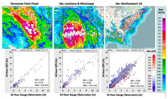The Q3DP algorithm became operational in October 2020 and has demonstrated very good performance so far, particularly in heavy rain associated with flash floods. Figure 8 illustrates its performance for the most significant flash flood events of the 2021 warm season in the US. One of them occurred in Tennessee on August 21 and resulted in 27 fatalities and another one was associated with Hurricane Ida during the period from August 30 to September 2 with a death toll of 67 people. The Hurricane Ida had its landfall in Louisiana and transformed from a tropical depression to a post-tropical cyclone that rolled into the US northeast two days later. Color-coded maps in the upper images in Figure 8 show 24-h radar-estimated rain totals and the circles, their comparison with rain gauges. The size of the circle is proportional to the rain amount whereas different shades of red and blue indicate various levels of radar underestimation and overestimation, respectively. White or pale colors indicate either the absence of bias or a small bias. Indeed, the scatterplots of 24-h totals versus their radar estimates shown in the bottom panels indicate very good performance in all three cases with the average bias below 10% and the correlation coefficient well-above 0.9.