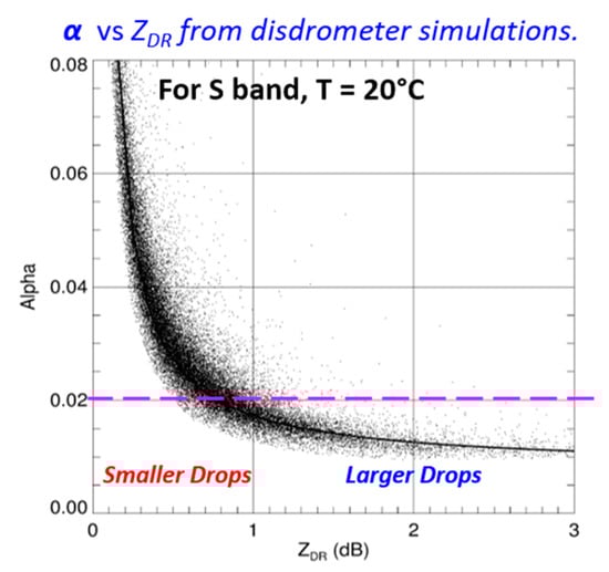 The scatterplot of α versus ZDR simulated from the Oklahoma disdrometer data at λ = 11.0 cm and T = 20 °C. Black curve represents the α(ZDR) dependence specified by Equation (8).