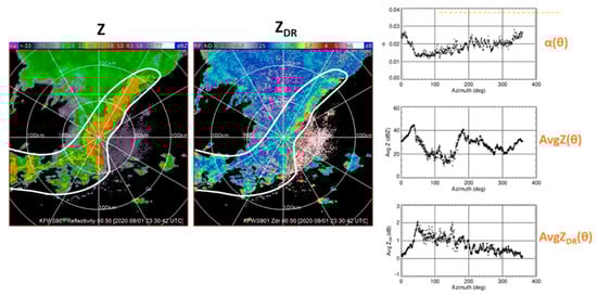 Azimuthal profiles of <α> estimated using Relations (10) and (13) for the case of a mesoscale convective system are presented in Figure 10 (upper right panel) using black and red dots respectively. It is obvious that Relations (10) and (13) provide very similar results. In the middle and bottom right panels, the azimuthal dependencies of Z and ZDR averaged over the whole propagation path in rain are displayed. As expected, the azimuthal dependence of <α> exhibits strong anti-correlation with averaged ZDR and the absence of correlation with averaged Z. The lowest value of <α> is observed in the azimuthal direction along the squall line in the NE sector.