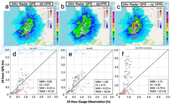 The concept of an “apparent” VPR or AVPR was introduced by Zhang and Qi [] and Qi et al. []. The VPR correction is performed in the “bright band affected area” (BBA) within the stratiform part of the storm that is identified using radar reflectivity Z and cross-correlation coefficient ρhv. The average radial profile of Z at the lowest antenna tilt is determined within BBA and subtracted from the radial profiles of Z at each particular azimuth. Then the standard R(Z) relation is applied to estimate rain rate. Therefore, it is expected that the radial dependency of Z is entirely determined by the vertical profile of Z through the ML and the vertical structure of a storm is horizontally uniform within BBA. This methodology assumes that the BBA is relatively homogeneous azimuthally and is called “tilt-VPR”. Such an assumption can fail in the presence of frontal boundaries with large variations in the ML height which usually happens during cold season with lower ML. Hanft and Zhang [] suggested the so-called dpVPR methodology to derive azimuthally dependent VPRs which results in the overall improvement of the VPR correction as illustrated in Figure 11. In the absence of the VPR correction, the 24-h radar derived rain totals are greatly overestimated (blue circles in Figure 11c,f). The positive QPE bias is dramatically reduced with tilt-VPR correction applied (Figure 11a,d) and the QPE results are further improved after the dpVPR correction scheme is utilized (Figure 11b,e). Note that, in addition to reducing the artificial enhancement of Z and R(Z) in BBA, the dpVPR algorithm also reduces the negative bias in R(Z) at longer distances from the radar where the radar beam is above the ML.