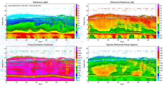 Range-defined quasi-vertical profiles (RD-QVP) of Z, ZDR, KDP, and ρhv measured by the KLSX WSR-88D radar on 30 January 2021 for the period of 7 h starting on 1700 UTC.