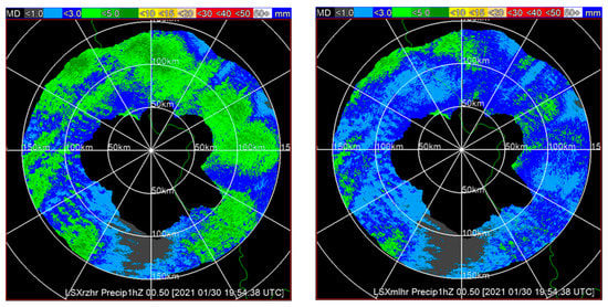 Maps of hourly rain total retrieved from R(Z) in the area affected by ML before and after PVPR correction of Z measured by the KLSX WSR-88D radar during the period from 18 to 19 UTC on 30 January 2021.