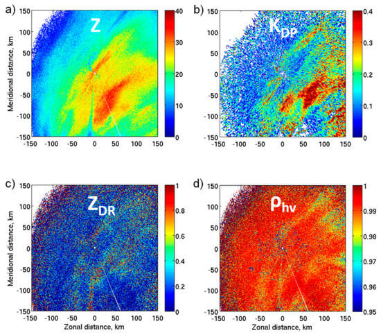 Because KDP is proportional to the radial derivative of differential phase ΦDP, it is immune to radar miscalibration, attenuation, partial beam blockage, and presence of water or snow on the surface of a radome. The immunity of KDP to attenuation makes it particularly beneficial for rainfall measurements at shorter wavelengths. The R(KDP) relation is commonly used if rain is mixed with hail as was originally recommended by Balakrishnan and Zrnic []. Until recently, it was believed that hail does not contribute much to KDP. This is not the case for melting graupel and water-coated hail of small size and high concentration. Moreover, small, and wet graupel/hail can produce anomalously high KDP well-exceeding typical values of KDP in rain. For example, Kumjian et al. [] measured KDP as high as 17 deg/km at S band in a storm producing large accumulations of small hail. If such a value of KDP is converted to rain rate using a standard S-band relation R(KDP) = 44.0|KDP|0.822, it would yield an unrealistic rain rate of 452 mm/h. In order to mitigate such an obvious overestimation, the R(KDP) with a smaller multiplier is recommended if the cross-correlation coefficient ρhv drops below a certain level (0.97) in areas of high Z indicating the presence of hail [], see Section 4. The KDP-based algorithms for rainfall estimation were used in a large number of studies and operational applications (e.g., [,,,,,,,,,,,,,,,,,,,,,,,]). A long list of various R(KDP) relations can be found in [] (their Table 10.3).