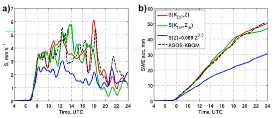 Radar snow measurements present an enormous challenge due to immense variability of snow particle size distributions (PSDs), density, shapes, orientations, crystal habits, and terminal velocities. Historically, radar reflectivity factor at horizontal polarization Z was used to estimate snow water equivalent rates S in the form of numerous power-law relations (e.g., [,,,,,,,]). The majority of these relations assume that Z is proportional to S2. Radar reflectivity is very close to the 4th PSD moment for low-density snow (e.g., aggregates) due to the inverse dependence of snow density on the snowflake size whereas S is proportional to significantly lower the order moment of PSD (2.1–2.2) []. This is one of the primary problems with existing S(Z) relations. The accuracy of S(Z) estimates is altitude dependent. At longer distances from the radar where the radar beam is much higher, the performance degrades due to the significant changes in Z with height, especially in aggregated snow. Despite these deficiencies, the conventional radar algorithms still utilize the standard S(Z) relations, which exhibit roughly an order of magnitude difference in the estimates of snowfall rate for the same reflectivity factor. This traditional approach is based on the usage of a multitude of climatological S(Z) relations optimized for different snow types and geographical areas. For example, the US National Weather Service (NWS) operationally uses several S(Z) relations for radar snow QPE (depending on the geographical region) as presented in Table 1 and it has not yet capitalized on the polarimetric capability of the WSR-88D radars.