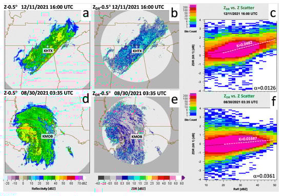 where ZDR > 0.2–0.3 dB. In Equation (8), ZDR is expressed in dB. In the existing R(A) algorithm, the parameter α is optimized on the scan-to-scan basis and determined from the slope of the ZDR(Z) dependence as described in [,,]. The use of a single factor α for a whole radar coverage area generally leads to some underestimation of light rain and occasional overestimation of heavy rain. This is attributed to the fact that light rain is commonly characterized by larger α whereas significantly lower α might be more typical for heavier rain often associated with deep convection, and the use of a single “net” α (or <α>) for both rain types produces such biases (see Figure 9).