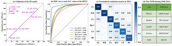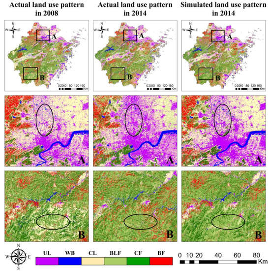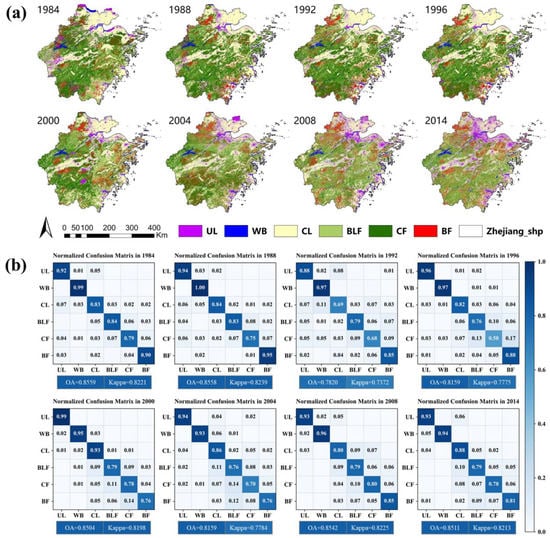 The land use of Zhejiang Province (Figure 2a) was classified into the following six types: urban land (UL), water body (WB), cultivated land (CL), broad-leaved forest (BLF), coniferous forest (CF), and bamboo forest (BF) [43,44]. The sample plots data (Table 1 and Table 2) were used to calculate the overall accuracy (OA) and kappa coefficient (Kappa) to evaluate the accuracy of the classification results. Figure 2b shows the normalized confusion matrices from 1984 to 2014. Each value of the main diagonal in the normalized confusion matrix corresponds to the producer’s accuracy (PA) value for each land-use type. It can be seen that the overall accuracy (OA) and kappa coefficients (Kappa) in different years were all higher than 0.78 and 0.73, respectively, indicating that the classification results were highly consistent with the actual situation. Moreover, most of the PA values were higher than 76%, which provides an important guarantee for spatiotemporal LUCC simulation in the study area.