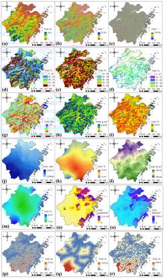 Topographic data in 2014: (a) DEM, (b) slope, and (c) aspect; soil data in 2008: (d) clay fraction, (e) sand fraction, (f) silt fraction, (g) soil available water content, (h) soil bulk density, and (i) soil wilt point; climate data in 2014: (j) total precipitation, (k) average temperature, (l) average radiation, and (m) average relative humidity; socioeconomic data in 2015: (n) population density, (o) GDP; distance data in 2014: (p) distance to road, (q) distance to railway, and (r) distance to water.
