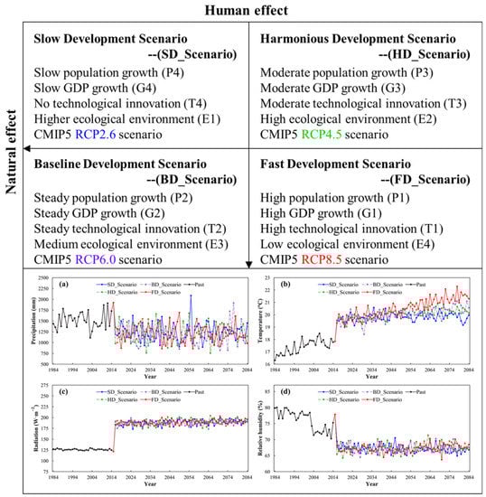 Four development scenarios (Figure 5) were designed based on the CMIP5 while considering climate variations together with different socioeconomic developments in Zhejiang Province.