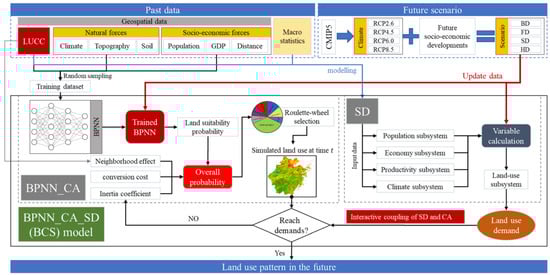 In the paper, we present the BCS model for multiple LUCC scenarios for future land use by coupling human and natural effects. The proposed model consists of an SD model and a BPNN_CA model. The SD model was used to project the land-use demand at the macro-level, and the BPNN_CA model was used to allocate land use spatially at the micro-level.