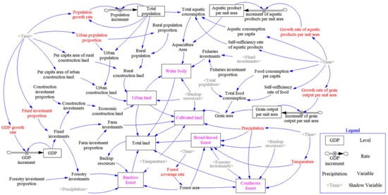 The structure of the SD model. Variables in red indicate the inputs of the model, which varied in different scenarios. Variables in purple represent the main outputs, including the areas of different LULC types. Purple ones were used to validate the model.