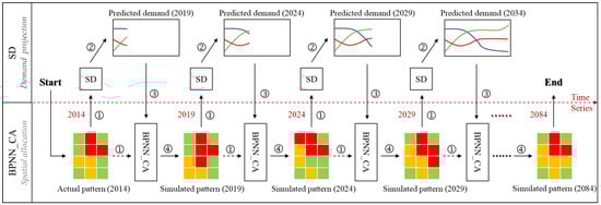 The flow chart used is shown in Figure 6. Firstly, based on the geospatial data in the past, sample sets were randomly sampled to train the BPNN, and then the overall probability was calculated, and the simulated land-use types were determined according to the overall probability and roulette-wheel selection mechanism. Secondly, macro-statistical data were used to establish the relationship between land-use area and macro-factors so as to capture the feedback loop between them. Thirdly, the SD model was interactively coupled with the CA model, and the simulated land-use pattern was output only when the spatially allocated area of the CA model reached the requirements of the SD model. Finally, when the model accuracy was valid, the inputs of the two sub-models were updated using future data to obtain the land-use pattern in the future.