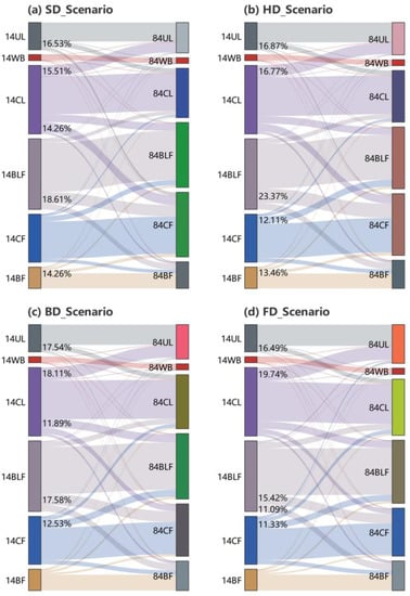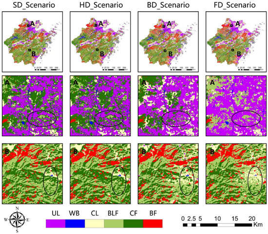 In summary, the aim of this study was to develop a BPNN_CA_SD (BCS) coupled model for future LUCC simulation and to analyze the LUCC of Zhejiang Province under different scenarios from 2014 to 2084. The BCS coupled model consisted of the BPNN_CA model and the SD model. The top-down SD model and the bottom-up BPNN_CA model were interactively integrated during the simulation. The simulation results in 2014 showed a great OA (0.8), Kappa (0.75), and relatively high FOM (>28%) value, indicating that the proposed model can simulate LUCC accurately. Under different scenarios, the future evolution of the LUCC simulated by the BCS model varied due to the different natural and human effects. By 2084, bamboo forests would increase by 37% under the FD_Scenario, while coniferous forests would decline by 25%. A comparison of the simulated subtropical forest area and spatial variation in the four scenarios revealed that the SD_Scenario was favorable to forest ecology. We also analyzed the future transfer area between land uses and the changes in each prefecture. These study results could provide an effective reference for decision makers regarding sustainable forest development and land-use planning under future climate conditions in Zhejiang Province.