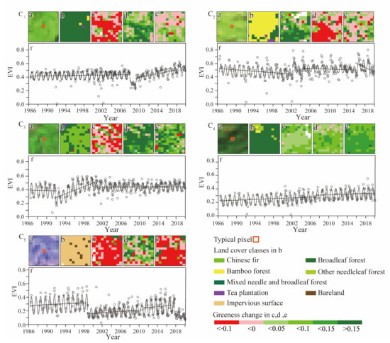 This region has a subtropical monsoon climate and elevation of 30~2154 m above sea level with obvious vertical vegetation zonality. The major vegetation types include evergreen broadleaf forest, needleleaf forest, needle-broadleaved mixed forest, bamboo forest, meadow, and tea plantation [38]. According to the regions with different protection levels and vegetation types, five 300 × 300 m typical plots were selected to show the vegetation change characteristics (Figure 1b). Plots C1 and C2 in Prots are dominated by broadleaf forest and bamboo forest, respectively. Plot C3 in Prot is dominated by Chinese fir with interspersed tea plantations. Plot C4 in NPys is mainly broadleaf forest, mixed with a few needleleaf forests and interspersed bamboo forests. Plot C5 in NPwy is predominantly impervious surface mixed with a few scattered barelands.