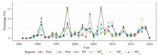 The percentage of negative abrupt change area each year from 1986 to 2020. Prots: Wuyishan Nature Reserve; Prot: non-nature reserve within Wuyishan National Park; NP: non-protected areas; NPgz: non-protected areas in Guangze County; NPys: non-protected areas in Yanshan County; NPwy: non-protected areas in Wuyishan City.