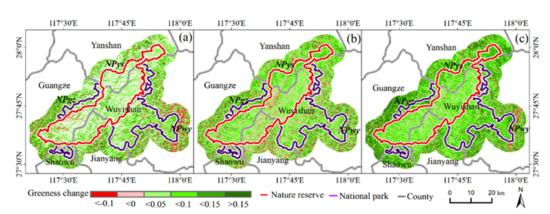 Recent studies have shown that land use (e.g., cropland and large-scale tree plantations in low-productive areas in China, and silvicultural practices in developed countries) is the dominant factor in global greening [1,2]. Protection measures (e.g., nature reserves, ecological functional zones) also provide an important basis for local vegetation greening [3]. Human exploitation and protection of land remain a complex and dynamic endeavor and have complex impacts on vegetation change and spatial patterns. China has carried out many conservation programs to promote vegetation restoration and mitigate climate change. However, the pressure on ecological environments has increased rapidly with the development of the economy and increasing human demand for natural resources in recent decades [4,5]. In these protected regions, the vegetation change was assumed to be increased greenness driven by natural factors, including natural growth and restoration and CO2 fertilization [6]. However, vegetation might degrade without human management, in advanced forest aging, and with climate change [7]. In the non-protected (NP) regions, vegetation change might be greening or browning, depending on its land use and cover. Evaluating the differences in vegetation changes in these complex zones (e.g., a national park and its peripheral areas) with human activities and protections can offer insights into their change mechanisms.