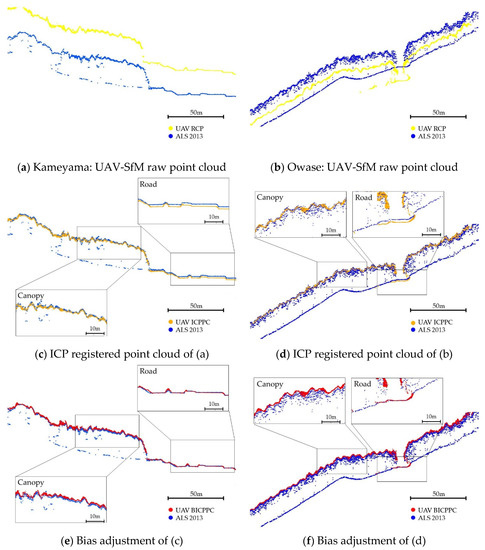 3.1. The Performance of the ICP and Bias-Adjustment Methods in Registering UAV-SfM Point Cloud Data to the ALS Point Cloud Model