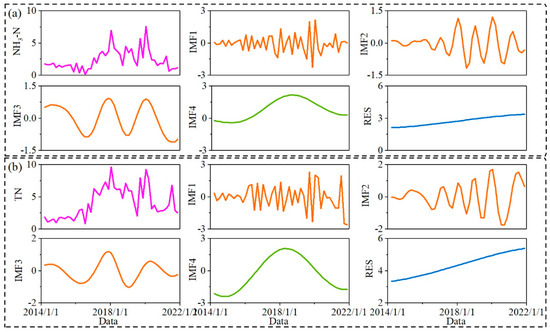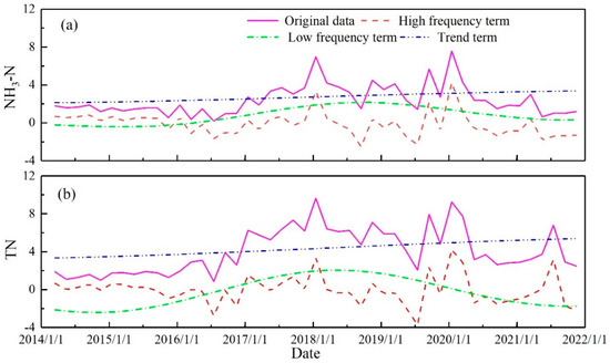 All water quality sequences, i.e., the NH3-N and TN monitoring data from 15 January 2014 to 15 November 2021, were decomposed by the CEEMDAN method (Figure 5). Then, the decomposed IMFs terms and trend terms were reclassified based on the t-test (Figure 6).