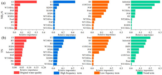 We used the RF method to estimate the importance of driving factors (determined by the relative importance for all driving factors), which was used for both the GA-SVMd model and the GA-SVMc model. As shown in Figure 7, the relative importance of driving factors significantly varied between the water quality variables and the corresponding data series and different frequencies.