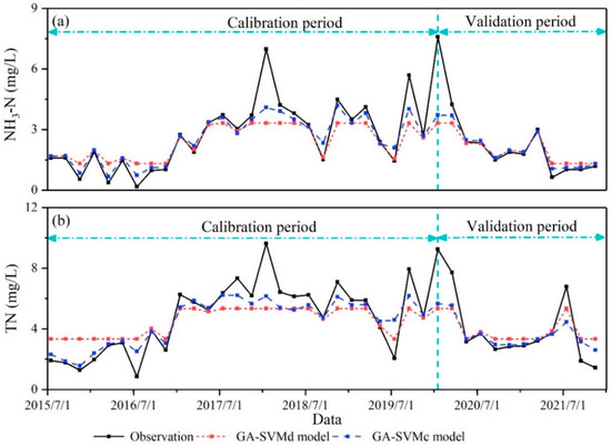 The proportion of the calibration period and the validation period was set as 0.7 for both NH3-N and TN; i.e., the period from 1 July 2015 to 15 January 2020 was set as the calibration period, and the period from 15 January 2015 to 15 November 2021 was set as the validation period. The results modeling with the GA-SVMd model and the GA-SVMc model both showed reasonable performance (Figure 8, Table 4). Apparently, the GA-SVMc model performed better in the prediction of water quality. Furthermore, the GA-SVMc model provided more accurate prediction results on the strong variations of water quality. However, the simulation accuracy of GA-SVMd model and the GA-SVMc were poor when the water quality dramatically changed, which may be due to the lack of measured runoff data in the study area. Non-point source pollution was usually the main pollution source during the rainfall-runoff process [48]. Therefore, it is necessary to strengthen the monitoring of runoff and water quality during rainfall in future research.