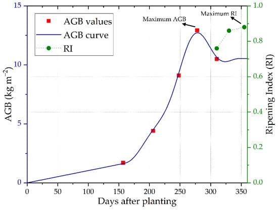 Measured above-ground biomass (AGB) and ripening index (RI) of the experimental area.