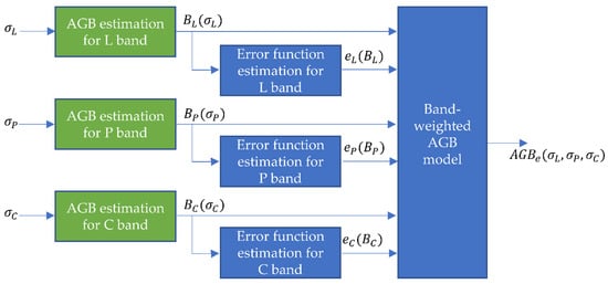 The methodology to estimate AGB from radar data can be represented as a block diagram, as shown in Figure 4. This methodology is divided into two parts: first, the information obtained from each frequency band– , and –is analyzed individually to create single-band AGB models (green blocks), and finally, these AGB models– , and –are weighted according to their efficiency in different ranges of AGB values to generate a final model for the AGB estimation– .