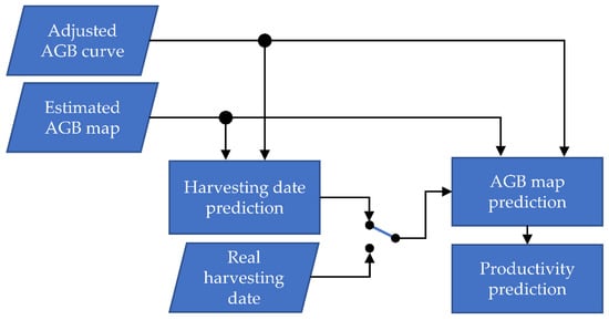 This section describes the methods for the harvesting date and productivity prediction in sugarcane crops of the test site. The procedure is illustrated in Figure 7, where the adjusted AGB curve is obtained according to Section 2.3 and the estimated AGB map is based on the method described in Section 2.2.4. This information is employed to obtain the harvesting date and the AGB map prediction.
