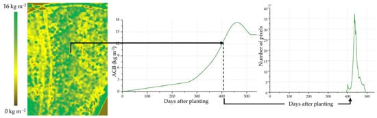 The estimated AGB map is analyzed to obtain a histogram of days according to the corresponding AGB curve. This procedure is carried out by taking the AGB value of each pixel, calculating the corresponding day after planting using the AGB curve, and storing the information in a histogram. This procedure, illustrated in Figure 8, is performed pixel-by-pixel until a final histogram is obtained.