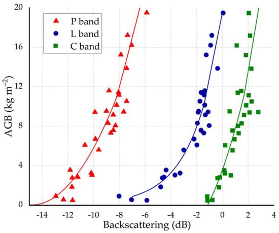 Backscattering of the P, L, and C bands versus measured AGB.