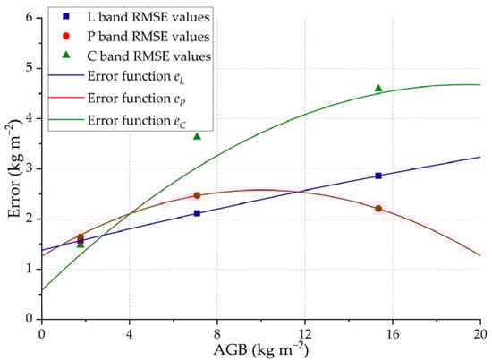 Then, a curve-fitting procedure using polynomial functions and the RMSE values from each single-band AGB model is used to estimate the error functions—, and . Finally, the band-weighted AGB model, , is obtained by weighting the AGB estimation of each band, considering the error functions [45], as shown in Figure 4: