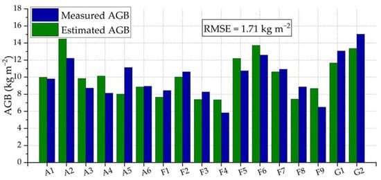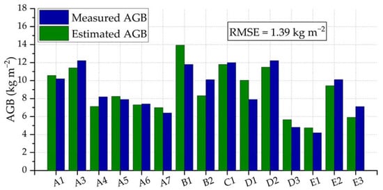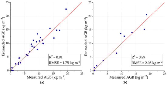 Table 3 shows three ranges of AGB values used to evaluate each single-band model, which is defined based on the saturation of each band according to the literature [26,27,28]. The root-mean-square error (RMSE) for each frequency band in the three ranges—, and —are calculated by comparing the measured and estimated AGB.
