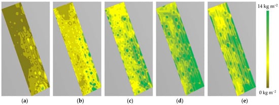 The estimated and measured AGB were used to generate AGB maps of the experimental area, as shown in Figure 12 and Figure 13. A moving average filter of 1.5 m × 1.5 m was applied over the SAR images to generate these maps. Higher AGB can be seen on the right-side than on the left-side in Figure 12 and Figure 13. Moreover, the decrease in AGB on 12 May 2020 is also perceptible, making the maps in Figure 12d and Figure 13d the ones with the highest average values. Finally, according to Figure 14, the band-weighted AGB model overestimates the AGB in the first two campaigns; however, the AGB calculated by biometric measurements is higher in the last surveys days.