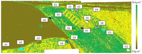 The test site was also surveyed with the drone-borne SAR system. Two survey campaigns were carried out and resulted in an RMSE of 1.39 kg m−2 (Figure 16) and 1.71 kg m−2 (Figure 18) for AGB estimation. These RMSE results have values close to that obtained in the experimental area, demonstrating the robustness of the proposed model against other scenarios. Furthermore, the lowest RMSE value was obtained in the 9 April 2020 survey than the 16 July 2020 survey, suggesting that the final model has higher precision for lower ranges of AGB.